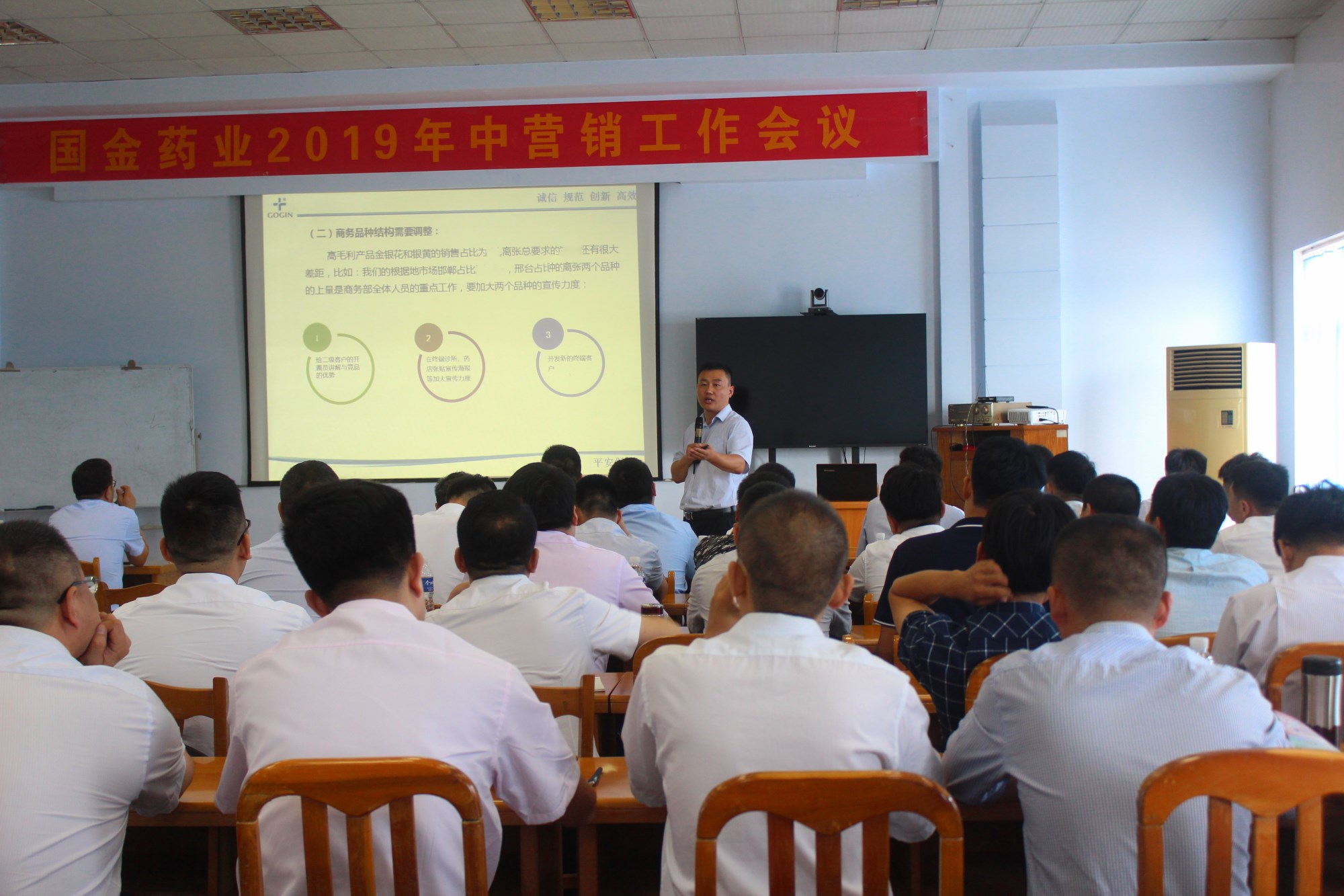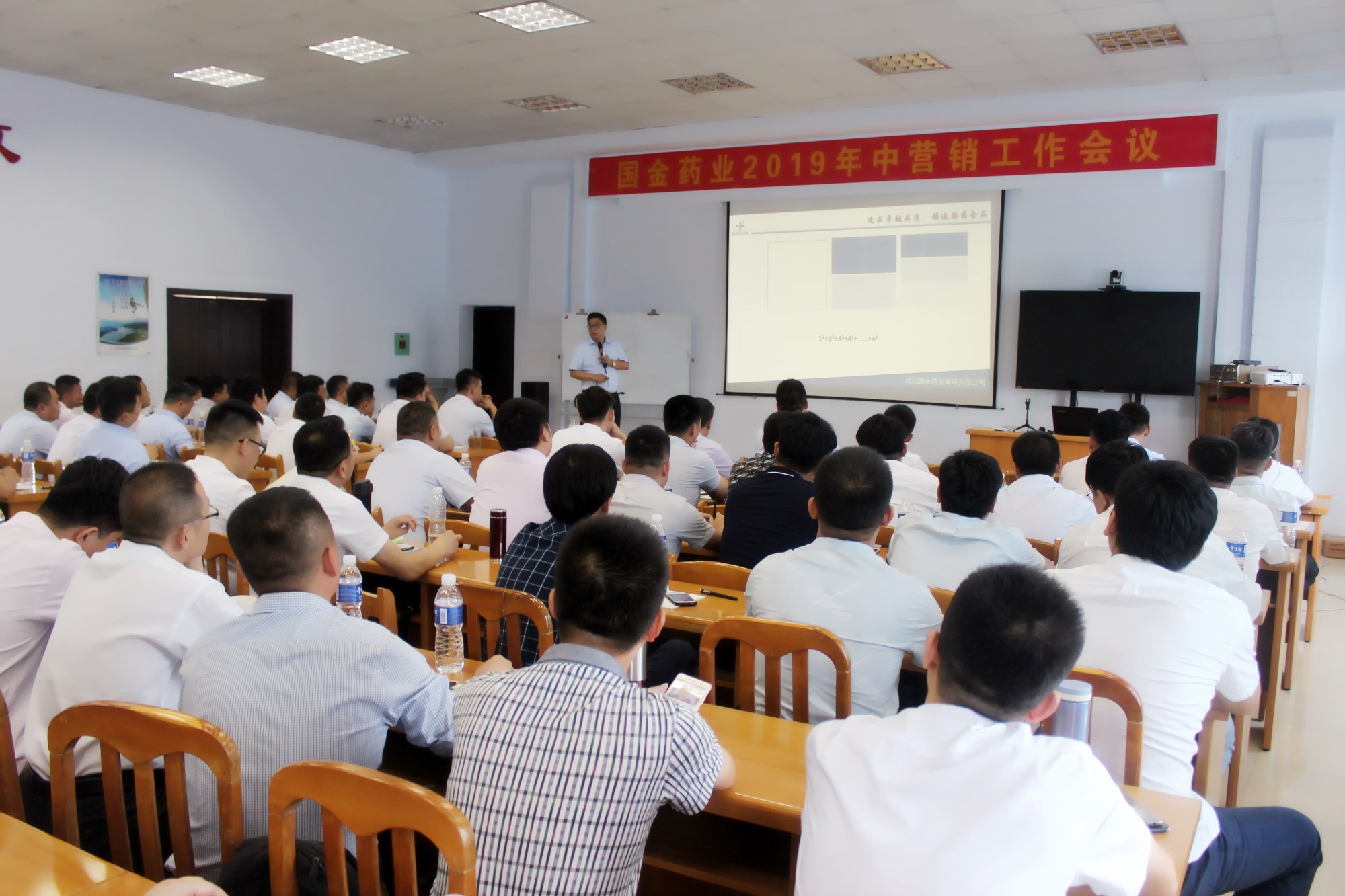 8月3日,國金藥業2019年中營銷工作會議在公司第三會議室拉開序幕,公司董事長、總經理張四巖出席會議并作了重要講話。公司各銷售部負責人李風雷、祝良國、郝增坡、李連保、張正峰、李保以及全國各地的主管以上人員共計100余人參加了會議,為期三天。
